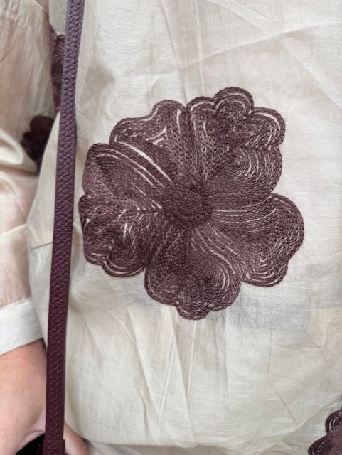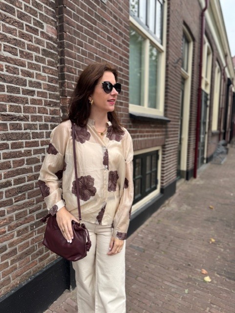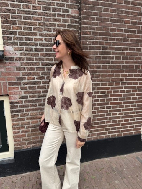 Wauw, deze blouse is niet zomaar een blouse. Deze prachtige beige damesblouse heeft bruin geborduurde bloemen op de blouse. Dit geeft de blouse een luxe uitstraling. De damesblouse heeft een klein kraagje en knoopjes.