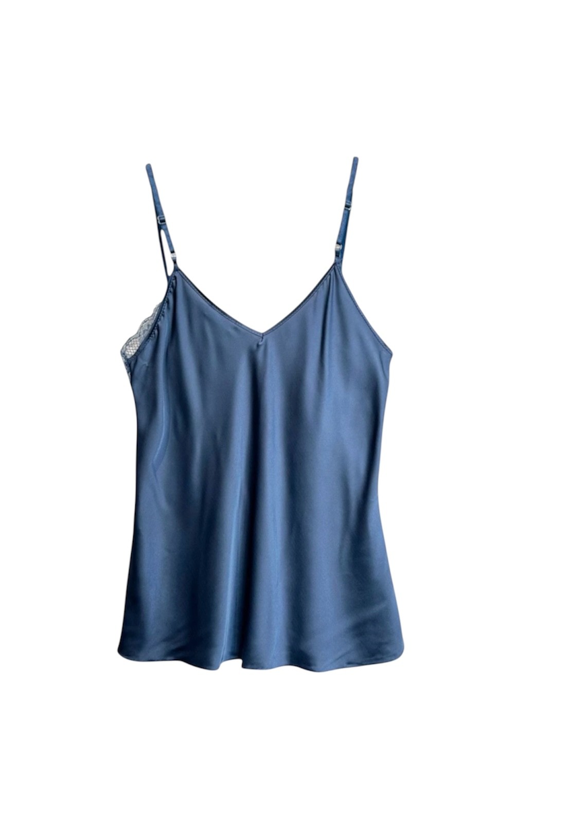 Deze prachtige basic top in de nieuwe kleuren van het komende seizoen, navy blauw is een item waar je heel blij van wordt! Deze satin look top heeft een mooie v hals met kant. De bandjes kun je verstellen. Nu super op een mooie jeans of of rok. Straks helemaal leuk met en blazer eroverheen of mooi vest.