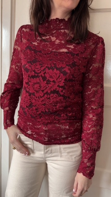 Wauw! Deze top is prachtig, een hele mooie bordeaux kleurige top met mooi kant. De stof heeft mooie kleine strass steentjes die de top een feestelijk uiterlijk geven. De kanten top heeft een opstaand kraagje en aan de achterkant wordt de top gesloten middels een knoopje. De stof is een fijne, elastische kanten stof die super fijn draagt.