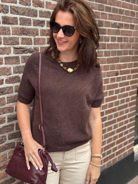 Richting de herfst is het toch wel fijn om iets warmere truitjes te gaan dragen. Dit gebreide bruine truitje is perfect voor het komende seizoen! Het dames truitje is gemaakt van super zacht materiaal en kriebelt niet. Het donkerbruine truitje heeft een mooie ronde hals en korte mouwen. Combineer de bruin gebreide top korte mouw met onze satijnen rok en bijpassende ketting voor een toffe ton sur ton look!