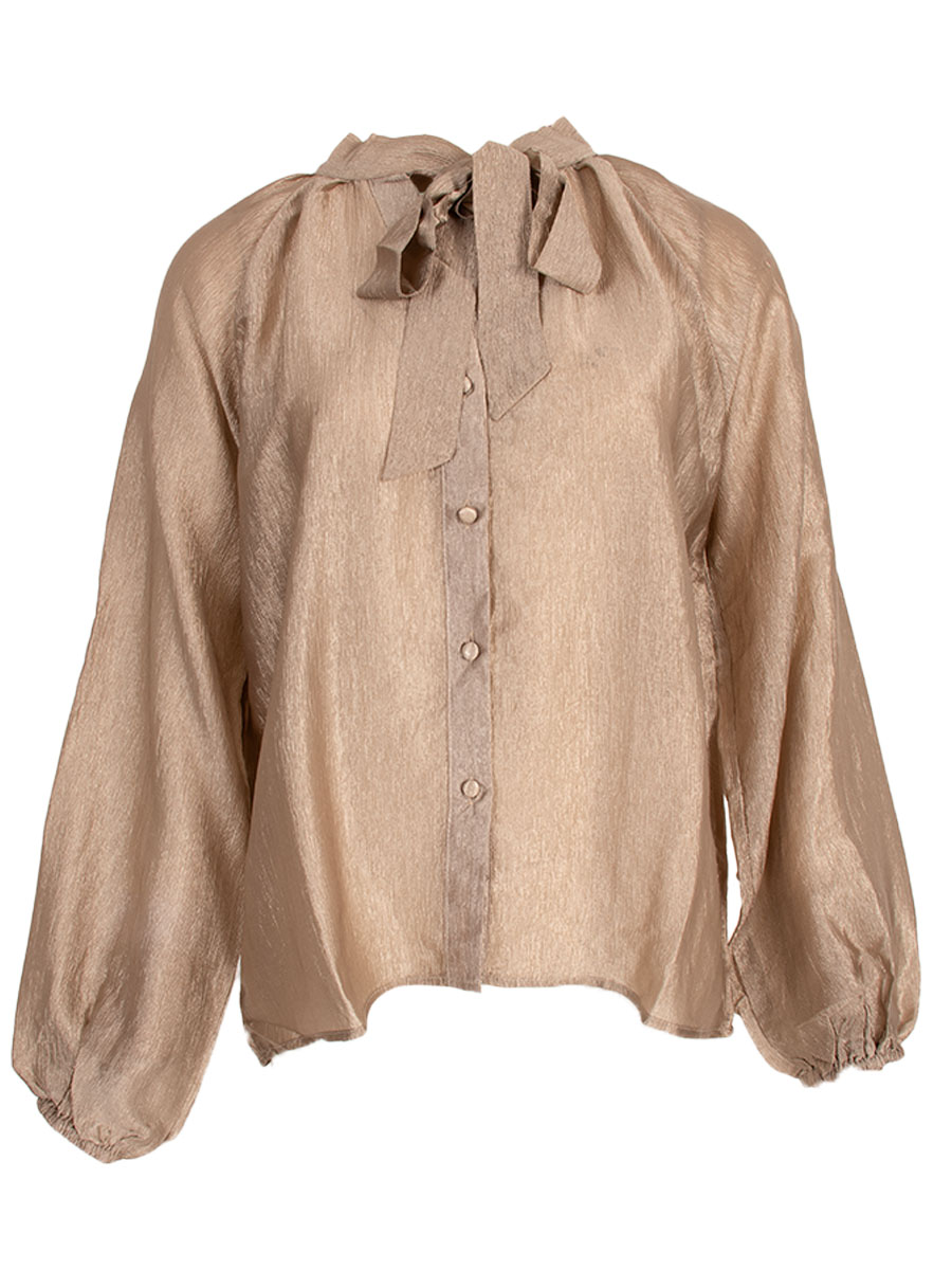Prachtige goudkleurige damesblouse met strik.van ons favoriete merk Azzurro. Deze feestelijke damesblouse in een mooie goudkleur is een blouse waar je veel plezier van zult hebben. De blouse heeft een mooie pasvorm en heeft leuke details. Mooie goudkleurige knoopjes een wat losser vallende mouw en een kort kraagje met strik.