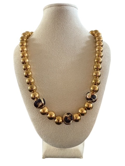 Hoe tof is deze goudkleurige ketting met panterprint kralen? Echt een eyecatcher deze statement ketting! De ketting heeft mooie ronde goudkleurige kralen. Door het materiaalgebruik zullen deze kralen niet verkleuren. Er zitten 3 stoffen kralen aan de ketting met een tof panterprintje.