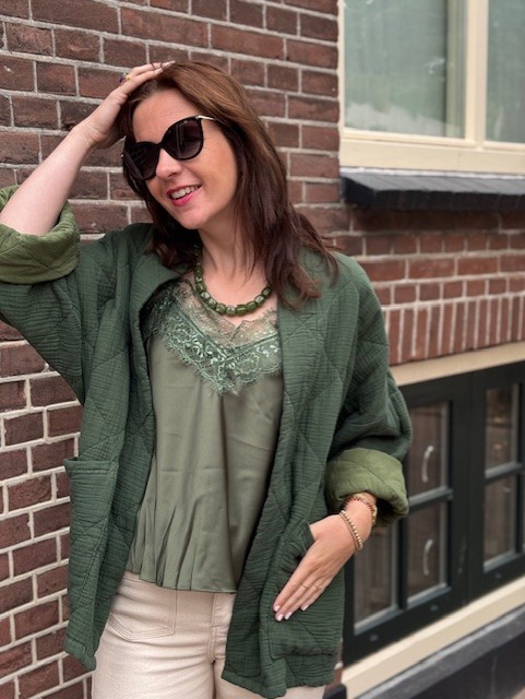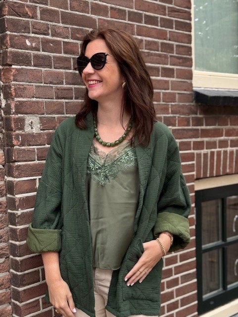 Het groene jasje lijkt op een kimono model. Dit houdt in dat het model recht loopt en de mouwen ook iets wijder zijn. De stof van het jasje is doorgestikt in een mooi ruitjes patroon. Aan de voorkant heeft het jasje 2 steekzakjes.