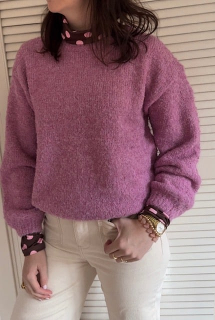 De trui heeft een mooie ronde hals en is perfect te combineren met onze bruine col met roze stippen. Deze kleuren matchen perfect met elkaar.