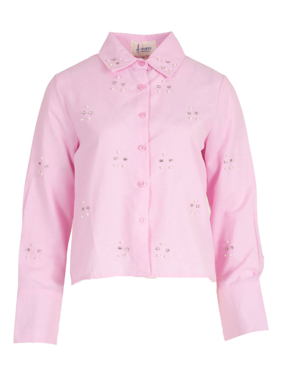 Een mooie licht roze damesblouse van ons favo merkje Azzurro. Deze damesblouse is niet zomaar een roze damesblouse, de blouse heeft aan de voorkant namelijk mooie parels en steentjes aan de blouse zitten. Dit geeft de blouse net dat extra!