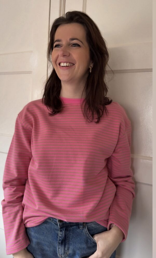 De pink stripe pull past perfect onder onze roze Azzurro bodywarmer.