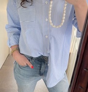 Streepjesblousen zijn hot! Deze leuke licht blauwe damesblouse met witte streepjes is zo een blouse die je in je kast moet hebben. De blouse is geen getailleerde blouse en valt wat ruimer uit. Op de voorkant van de blouse zit een leuk zakje. Je kunt de streepjesblouse blauw wit gemakkelijk knopen en hem zo wat korter maken. Of draag hem juist lang boven een toffe jeans!